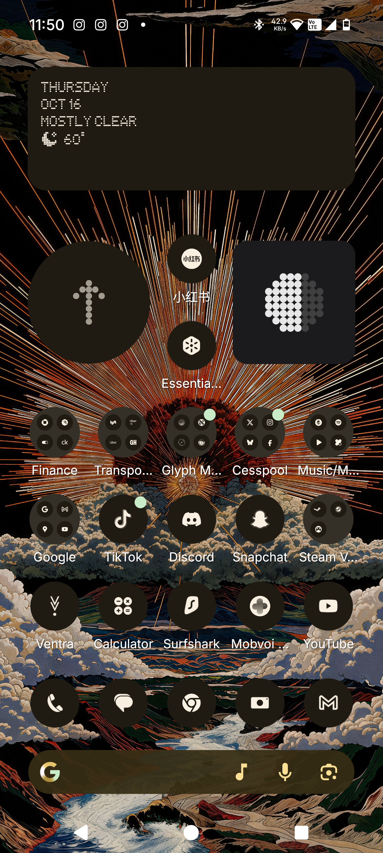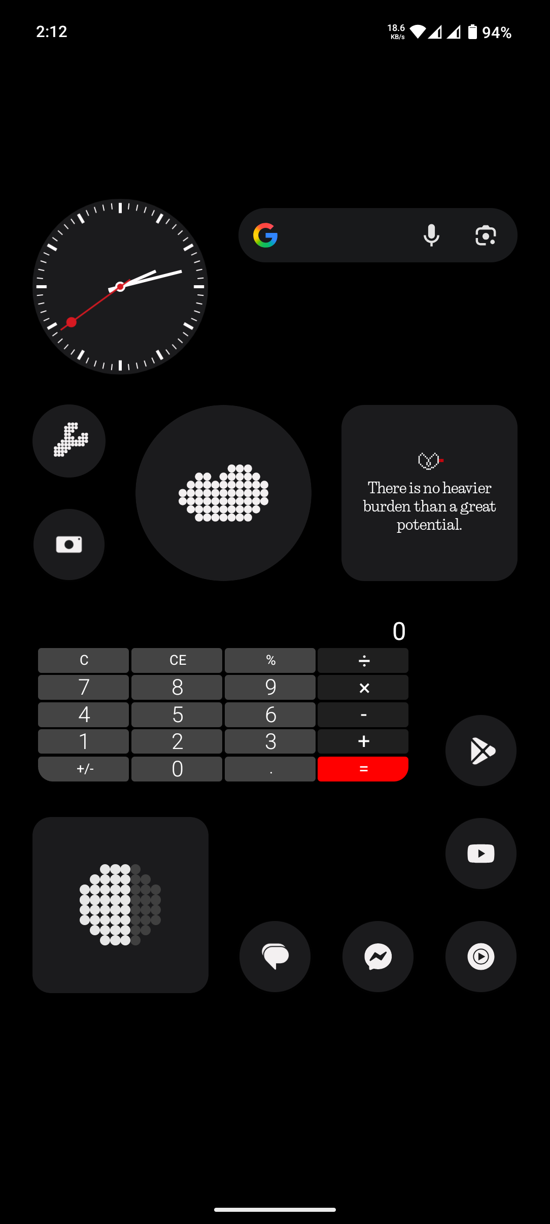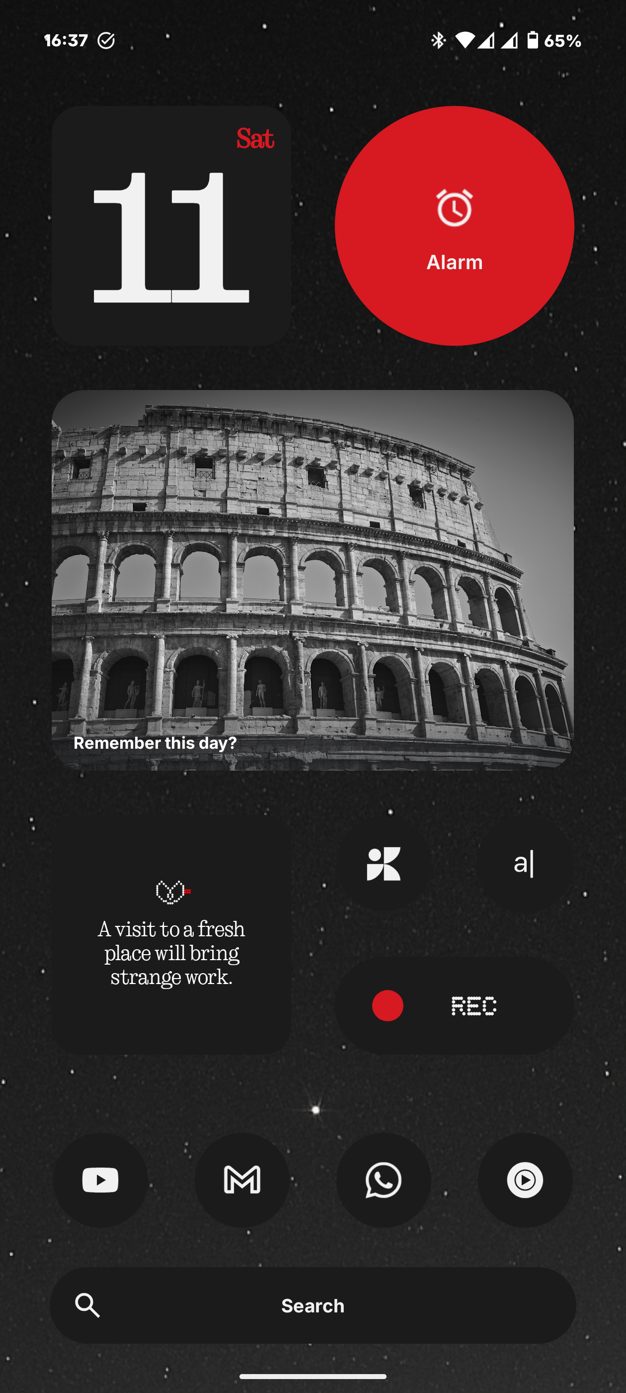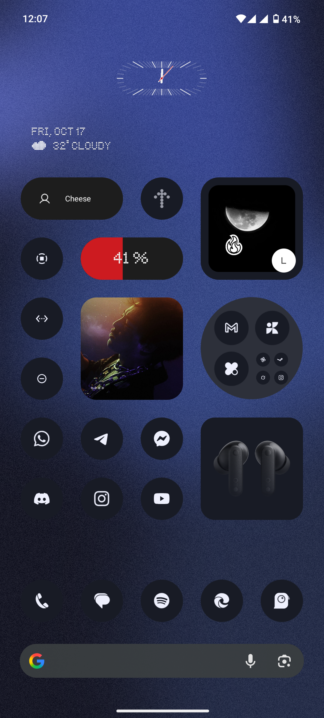 Cedrik This is my Homescreen Setup: This is my Homescreen i.e. the one that opens when I open my phone. It just has a simple overview over screentime, weather and the current time and the four apps that I currently use most although these change from time to time. It’s very simple since I hate it when home screens get to cluttered. When I swipe to the left I have music apps wiht the music widget. I don’t have YouTube on there since I otherwise use it way too much. For all the other apps I have I just search for them in the smart app drawer which is btw in my mind one of the best features of Nothing OS it looks so much cleaner then apples one and in my experience also categorizes the apps a lot better and we don’t even have to mention the way Samsung does it. What I also do often is search in the search bar in the smart App Drawer which is again one of my favourite features that Nothing has.