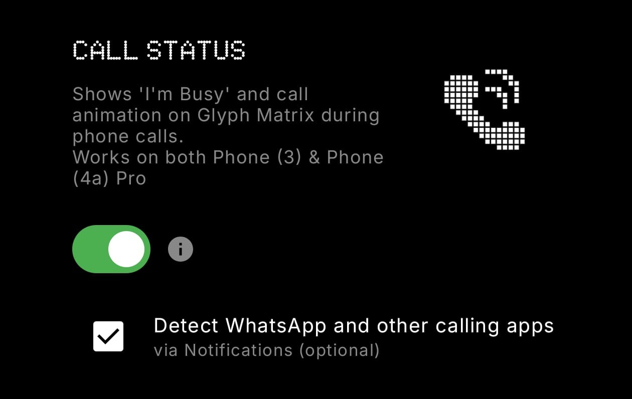 When you’re on a call - whether it’s a regular phone call, WhatsApp, Google Meet, etc, your Glyph Matrix shows an animated phone icon + “BUSY” indicator.